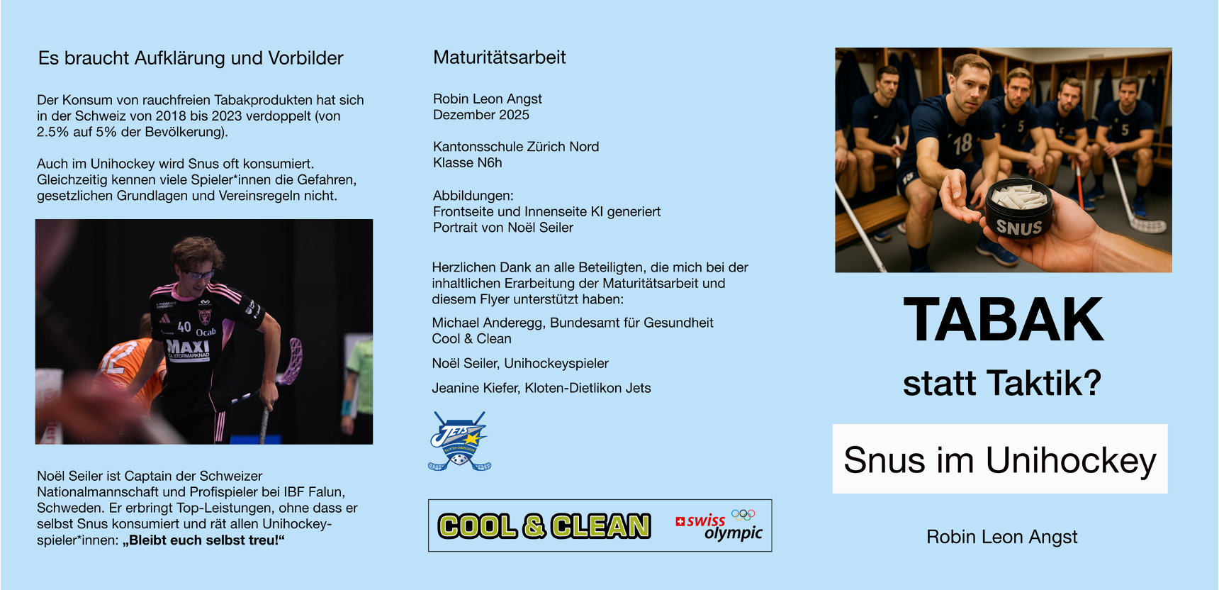 In seiner Maturitätsarbeit setzt sich Robin Leon Angst mit dem zunehmenden Konsum von Snus im Unihockey auseinander. Die Arbeit zeigt auf, weshalb Aufklärung, Wissen und Vorbilder im Sport eine zentrale Rolle spielen, insbesondere für Kinder und Jugendliche.
