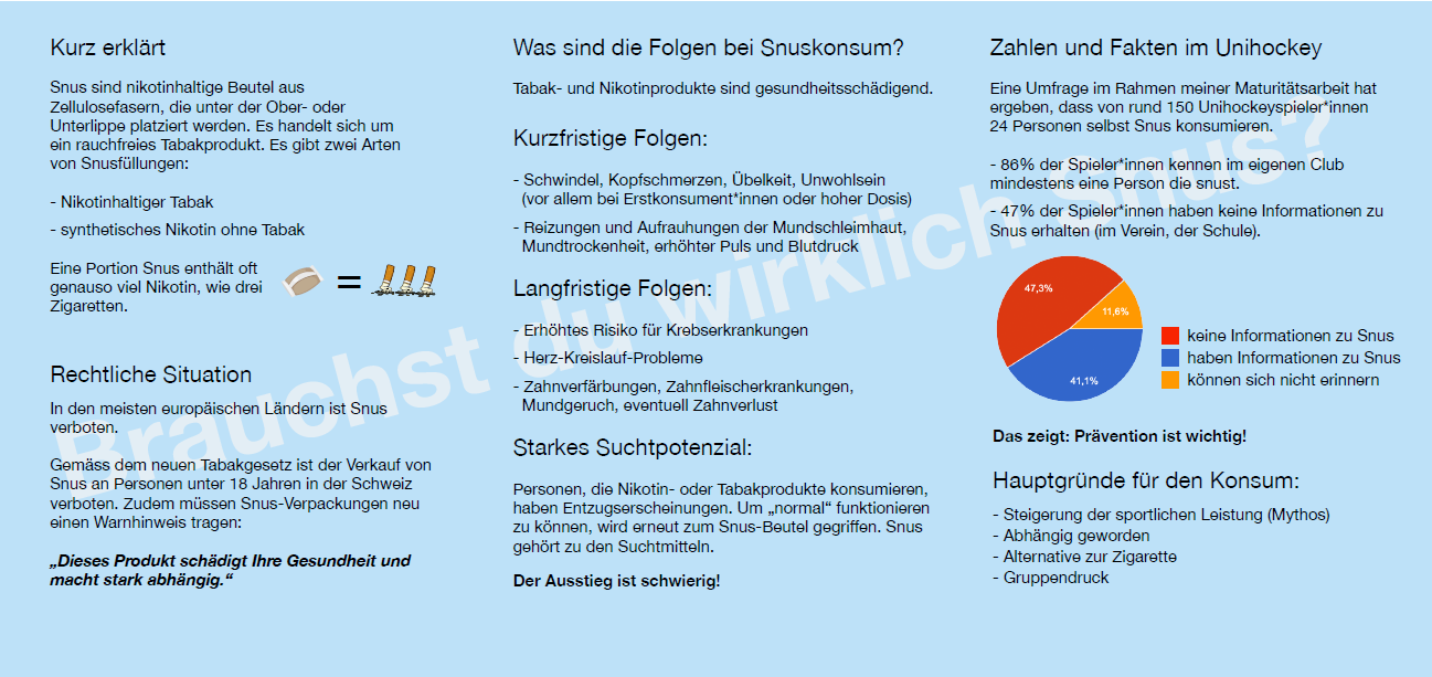 Die Arbeit erklärt verständlich, was Snus ist, welche kurz- und langfristigen Folgen der Konsum haben kann und wie hoch das Suchtpotenzial tatsächlich ist. Eine im Rahmen der Arbeit durchgeführte Umfrage unter Unihockeyspielerinnen und Unihockeyspielern zeigt zudem, dass viele zwar Snus im eigenen Umfeld kennen, aber kaum über Risiken, gesetzliche Grundlagen oder Vereinsregeln informiert sind. Prävention findet oft zu wenig statt – weder im Verein noch in der Schule.