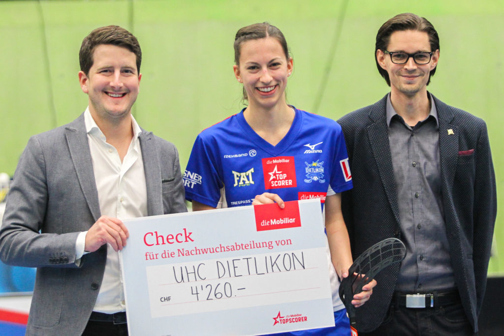 Topscorerin Andrea Gaemperli (Nr. 5, UHC Dietlikon) wird vor dem Spiel geehrt