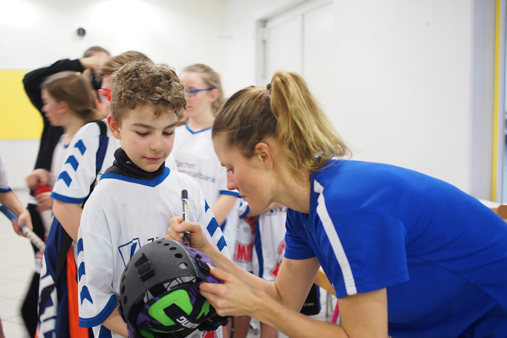 Linn Lundström signiert eine MaskeUnd so kamen die Juniorinnen und Junioren nicht nur in einem, sondern in zwei Trainings voll auf ihre Kosten. Die frisch gebackene Cupsiegerin Lundström holte das versprochene Training am vergangenen Donnerstag nach. Wie bereits im Training mit Jansson entschädigte nicht nur das Präsent von Limmatal, nein auch die leuchtenden Kinderaugen während dem Training.