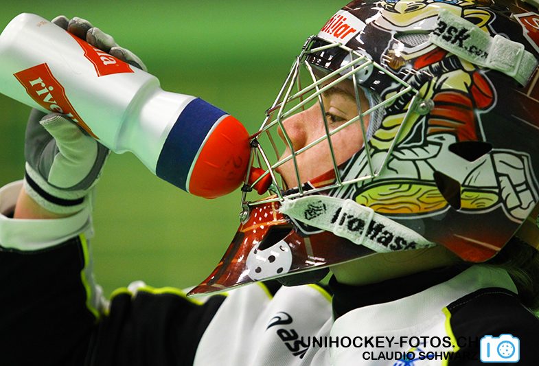 Monika Schmid nimmt einen kräftigen Schluck, © unihockey-fotos.ch